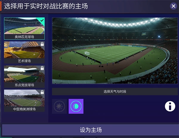 在全新版本中,玩家可以更方便的查看同一球场选择各类天气和时段效果,各个不同场景,不同时段的场景效果一目了然,玩家可以更加方便的选取自己喜欢的球场设置为主场,置身其中,享受比赛。