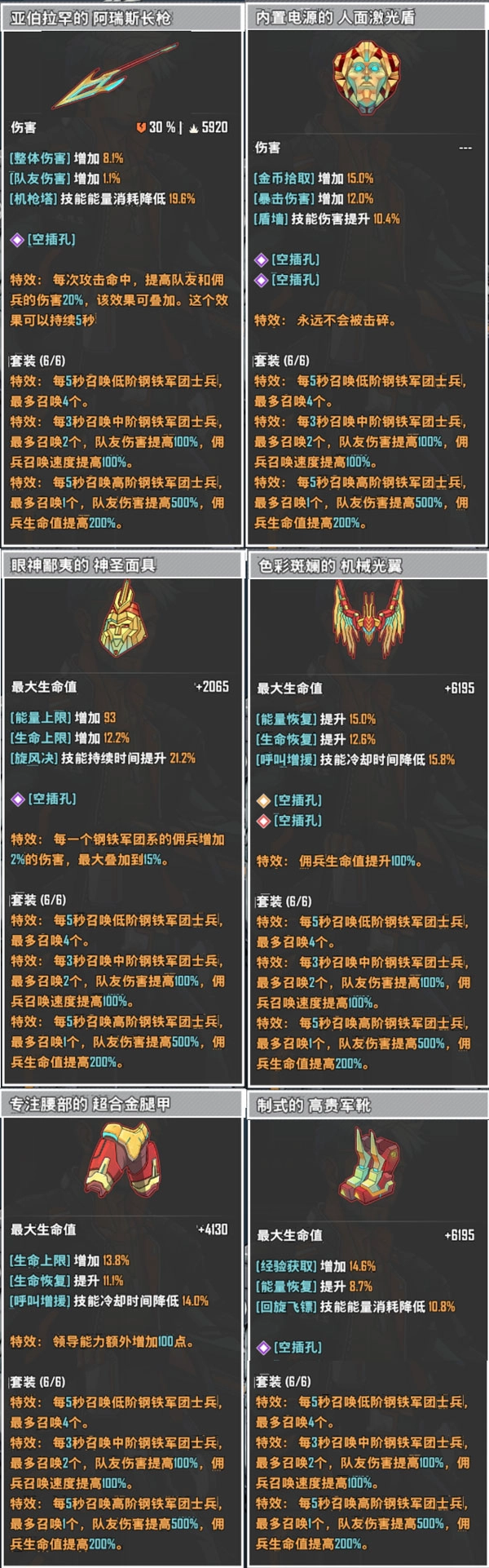 该套装的属性是每隔几秒就召唤出不同品阶的钢铁军团士兵为你战斗。只要你还活着,你的小弟们将源源不断加入战斗。穿多越多,整体套装属性就越强!