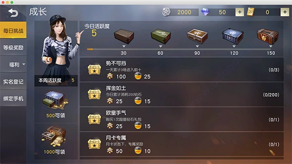 玩家每天可完成每日挑战任务面板里的任务,获得一些经验值、活跃度、银币等奖励,任务次数每天24时重置。玩家点击游戏界面下方的“成长”字样的美女图标,可进入到每日挑战任务面板。若有已完成的每日任务,“任务”图标处会显示完成的任务数量。玩家进入到每日挑战任务面板,就能领取对应的奖励。