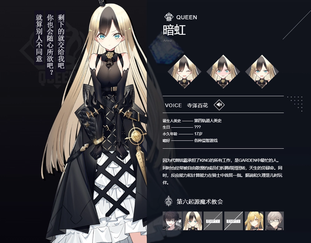 从诞生于第一轨道「剑锋凛光」的荣耀战士,到第二轨道「千紫」的神秘巫女,再到第八轨道「零射橙」的元气少年,在此邂逅形形色色的「骑士」,编织属于你们的羁绊吧!