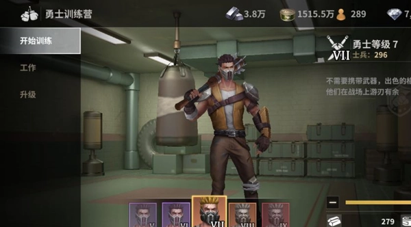 4、训练士兵积存力量末日的灾害和外敌的入侵不会就此停止,维持好避难所的正常运转后,迅速填充抵御外敌的力量迫在眉睫。射手、勇士、防卫者,三种兵种各具不同的优势。射手偏向战术攻击,勇士偏向攻击,防卫者偏向防御。升级训练营和军营的等级可以提升士兵的等级和士兵的数量上限,有助于增强避难所的战斗力,具有强大的战斗力对外敌可产生一定的震慑作用。