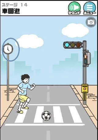 第十四关,等小明走到马路中间,点一下左边杆子上的时钟使用时间暂停…真的是时间暂停,在点一下右边红绿灯杆下面的黄色的开关,等红灯了在点时钟就过关了!!