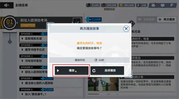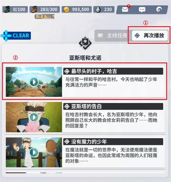 如果魔导士大人想回忆冒险中的精彩瞬间的话,可以点击①「再次播放」按钮,查看可播放的所有剧情视频目录,再点击②「想要观看的视频」,再次观看美好的剧情故事~