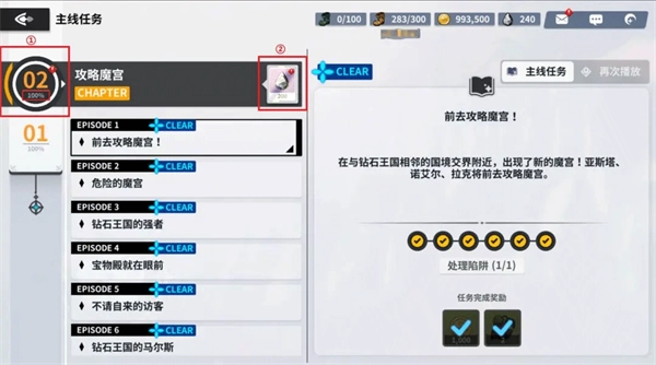 在完成任何章节的①「全部任务」后,需要魔导士大人亲自点击②「章节通关奖励」,才能获得该章节的通关奖励。