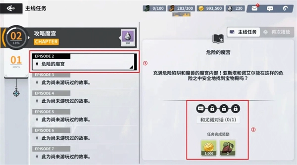 魔导士大人们可以在任务栏中查看①「主线任务」以及②「任务内容」和「完成任务时可获得的奖励」。在魔导士大人完成篇章任务时,可以自动领取该篇章的奖励呢!