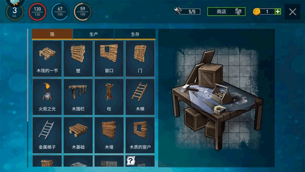 2、没有食物和水你很快就会死去,刚开始可以用小木板从海里搜取资然,后期则要制作更加好的装备。