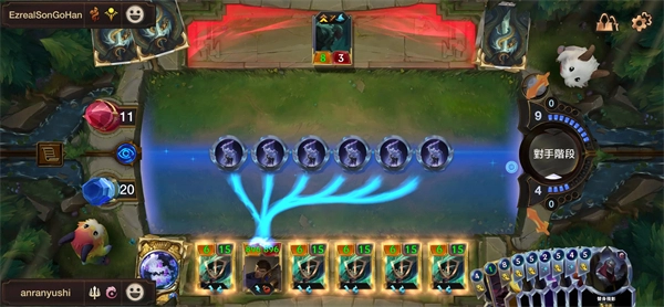 开局一定要把高魔力消耗的卡牌替换掉,否则会严重拖累战斗节奏,这是因为无论暗影岛还是诺克萨斯都没有主动抽取卡牌的能力。前期上伊莉丝和小蜘蛛格挡敌人,拖的越久我方胜率越大,后期用毁灭风暴摧毁残血主堡即可。