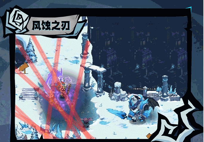 2、风蚀之刃:绯红的光束如利刃贯穿天地,激光如狂岚般席卷全场,撕裂一切防御。风蚀之刃释放前摇较长且间隙较大还是比较好躲避的。