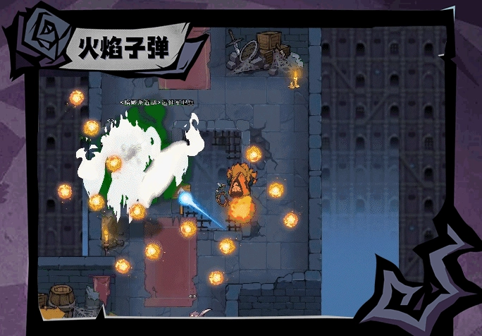 1、火焰子弹:向全角度连续发射直线飞行的火焰子弹。每一波发射8个子弹,一共发射6波守护者注意拉开距离进行躲避!