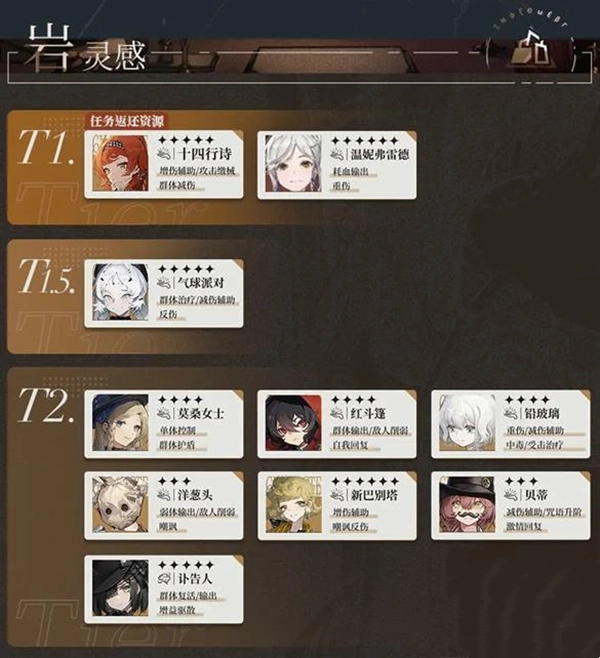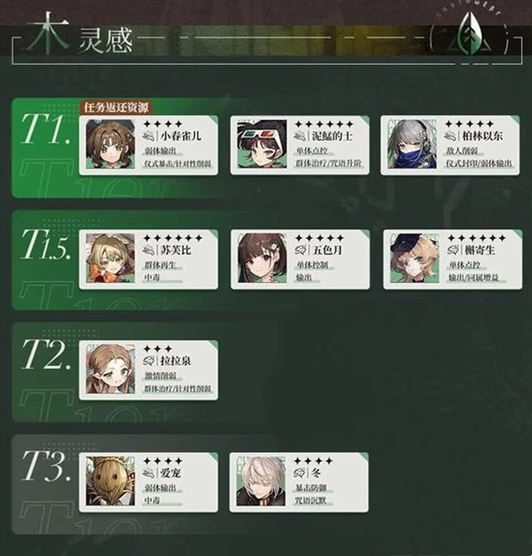 T1:星锑(暴击收益/伤害规避)、夏利(单体输出/反制驱散/群体增益)