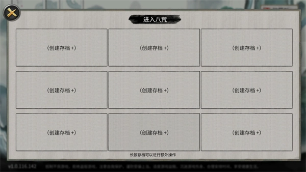 2、点击屏幕后,你可以查看自己的存档,新手玩家没有存档,可以点击任意空存档开始新游戏。