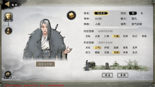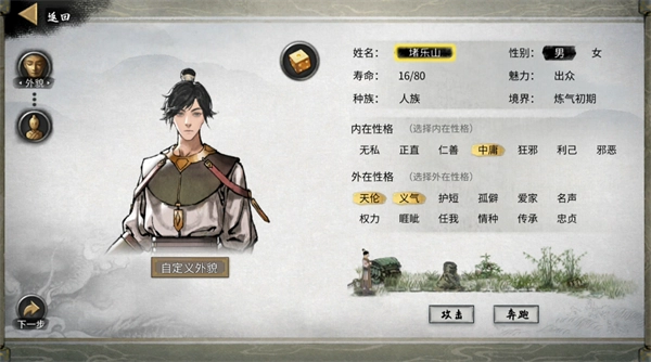 4、在等待一段加载的时间后,玩家可以进入人物信息界面,在这里你可以自由修改角色的姓名、性别以及内在外在的性格,这些都将影响到游戏的发展,并且还可以自定义外观捏脸,不同的捏脸还能提升魅力值。