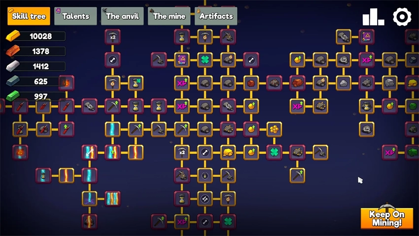 消耗材料锭来解锁技能树中的升级。这些升级会永久提升您的属性,让您以更强大的力量开采岩石!