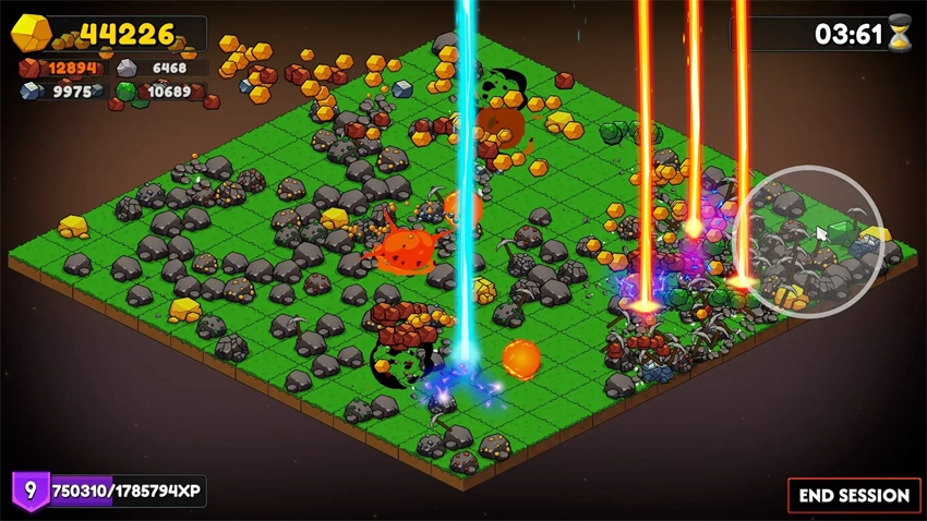 每次升级,您都会获得一个天赋点。消耗天赋点来显示3张随机天赋卡——选择一张保留!选择一张卡会提高天赋等级,同时也会增加岩石的生命值。