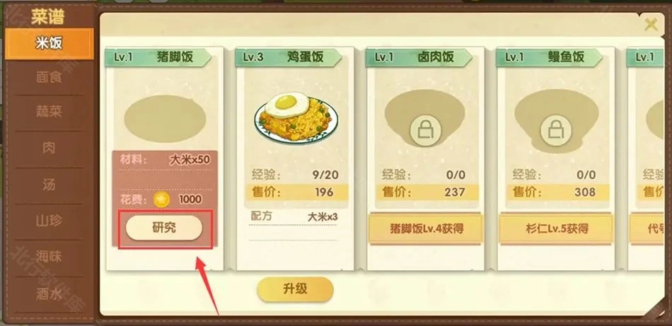 2.解锁菜谱后,记得点击“研究”,否则厨师无法制作这道菜,餐厅也无法通过它盈利。此外,升级菜谱不仅可以提高菜品的单价,增加收入,还可能解锁新的菜谱。不过,如果前期资金紧张,不建议急于升级菜谱。