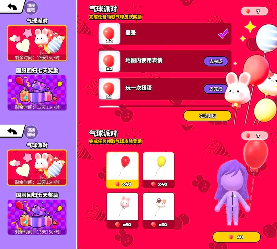 金币和徽章:日常的活动任务签到就可以获得,可以用来抽扭蛋,购买官方装扮和动作