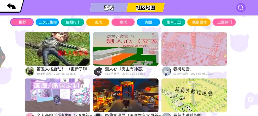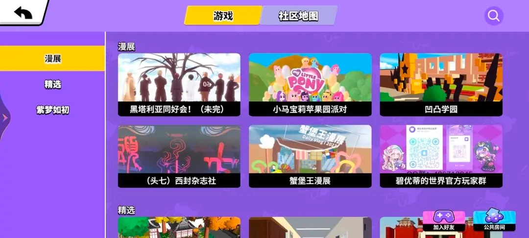 〖社区地图〗中有不同的地图分类,可以根据需要随意游玩,游玩过程中遵守地图内游戏规则可以获得更好的游戏体验