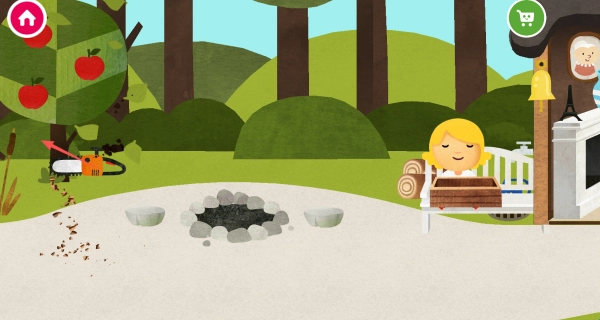 2、还可以拿上场景中的道具去使用,比如用这个锯子去锯树,然后将木头放入火堆。