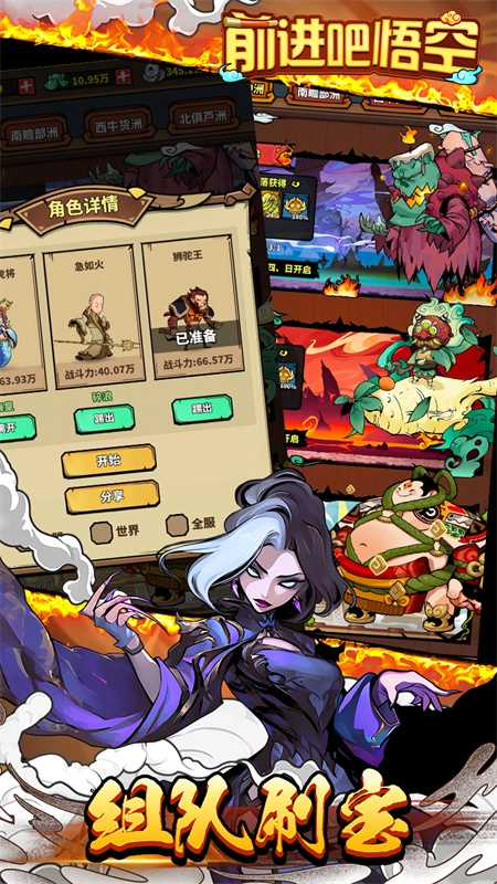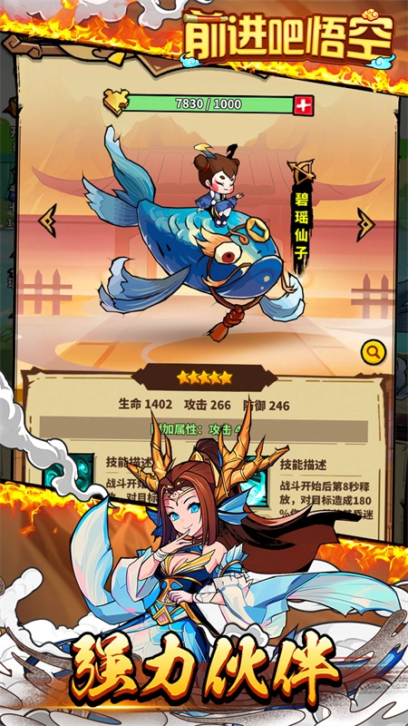 前进吧悟空这款放置类卡牌游戏中,玩家将重温取经路上的种种考验,不再仅仅是观看经典剧情,而是通过策略与阵容的搭配来亲身经历九九八十一难。每位角色都拥有独特的技能与属性,悟空的强力输出、八戒的肉盾防御、沙僧的团队辅助、唐僧的治疗能力,缺一不可。玩家需要根据敌人的属性与弱点来选择最优阵容,从而在战斗中发挥最大效果。即使在挂机状态下,角色们依旧会自动战斗、积累经验与资源,确保玩家离线也能持续成长。