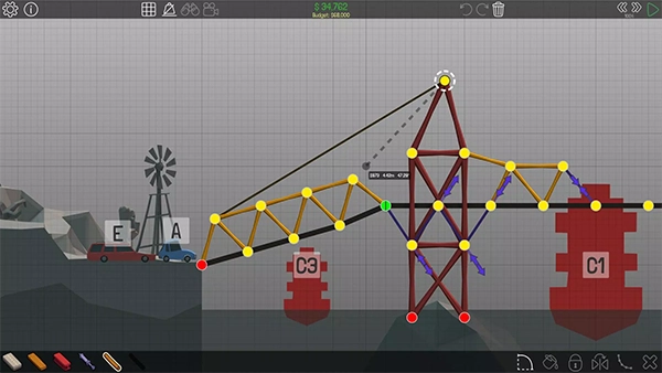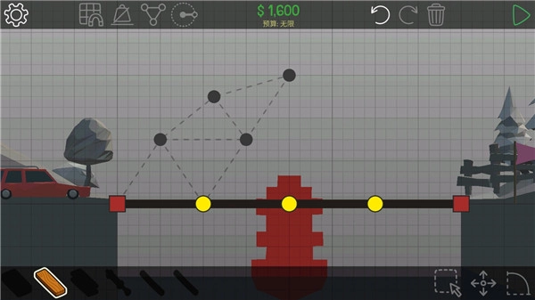 保利桥这款桥梁建造模拟类手机游戏以“高自由度与真实物理”为核心特色,让玩家在挑战性与创造性之间寻找平衡。作为一名桥梁工程师,你需要面对各种复杂地形,从蜿蜒的山谷到湍急的河流,每个关卡都要求玩家运用巧妙的结构设计与严谨的预算控制。游戏为玩家提供了多种建筑材料,包括木材、钢材、缆绳、混凝土等,每种材料都有其独特的物理属性与成本限制。你需要在预算范围内设计出最稳定、最经济的桥梁结构,并在建造完成后进行载重与耐久测试,以验证桥梁能否安全通过汽车、卡车甚至火车的行驶考验。