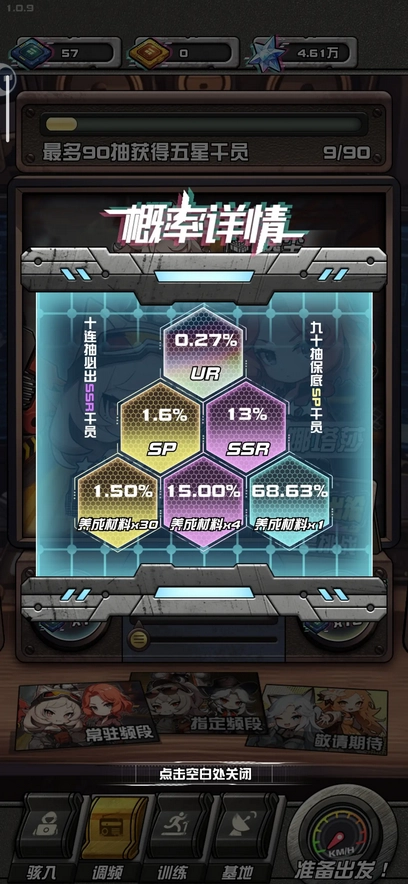新手进游戏第一步先随便抽抽卡获取一下角色。角色分UR(彩色)SP(金色)SSR(紫色)。后续看看广告都会全角色满命的不用急。