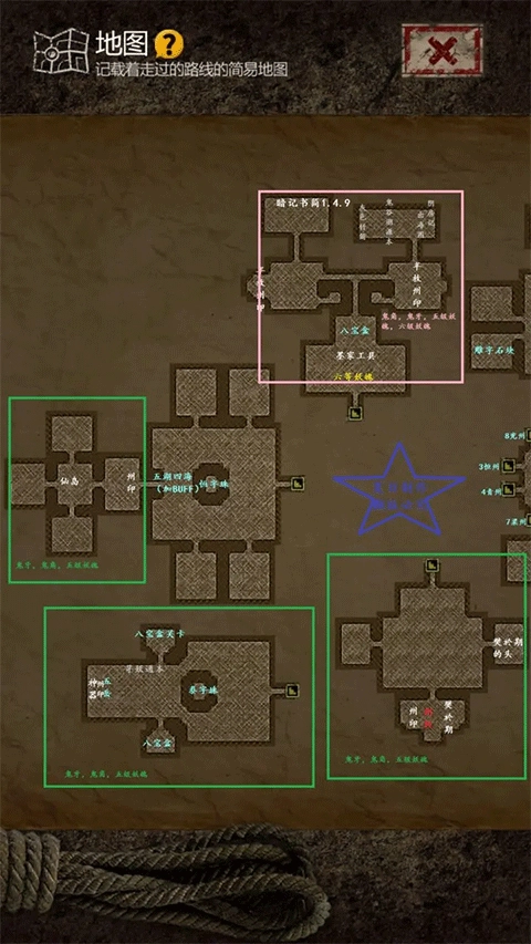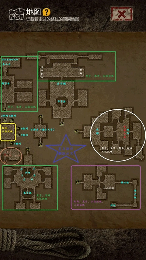 全图只要按照房间顺序走就不会卡关,我已经标记了房间序号,其中只有雕字石块和华字珠是要先去下一个房间拿到后再回头开。【每个州的房间里一定有州印,州印的位置都在图中标识清楚了,大家可以看到】PS:推荐在主厅刷够材料升几个三星人物,在此之前看到盾兵就跑,打不过,别硬刚。