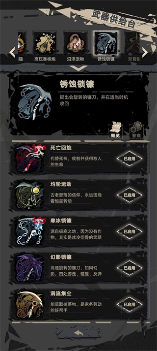 镰刀,目前最强武器(别喷,会玩就是最强),单次伤害虽然不高,但范围大,持续久,伤害频率高,词条优先数量(除了冰镰)和间隔频率(除了绿镰),特殊词条都可以不选,但数量一定要多,最好的是蓝镰,自带数量和减速,词条只要间隔频率和持续时间,一旦重塑成,这局就稳了,红镰,自带吸血,伤害一般,保命哥,但没有红枪强(镰刀会跑和收回),绿镰,永久性固定,不会往回收了,紫镰,单个范围变大,自带弹反,伤害中等,金镰,吸经验的,工具镰