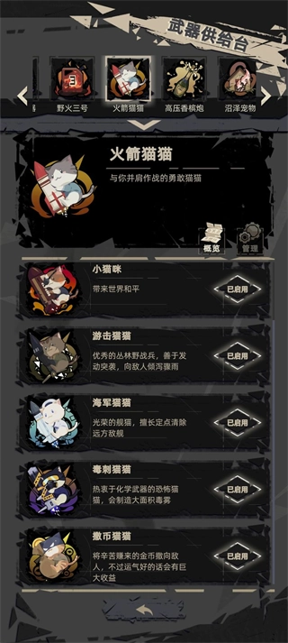 猫猫属于前期弱,后期猛代表,紫猫大范围放毒,红猫,核弹了解一下(除开间隔大,没其他缺点),蓝猫频率很高,专炸后排,就算是杂色猫也在其基础上,极大增加了导弹范围和伤害,极力不推荐金猫和绿猫,绿猫放弃了导弹,转换成类似萤火虫的攻击,伤害不升反降,范围好像加的也没其他猫大,而金猫就是金币流叛徒,别人挣钱,他花钱,看肝出来的钱被到处撒,心那个疼啊,看技能好像可以跟金磁搭,实测并不明显
