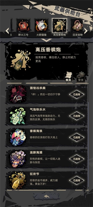 香槟,娱乐武器,是真的好玩,伤害不高,但机制有趣,会自我击退,特别是快乐水(绿槟),强度党可以不选,娱乐党必选