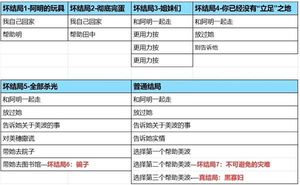 游戏拥有坏结局和普通结局,坏结局有5个而普通结局只有1个,下面提供触发不同结局的关键剧情选项给玩家参考: