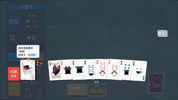 玩家初始携带一个52张扑克的牌组,手中始终有8张牌,出牌或弃牌后会自动补满,但次数均有限制。
