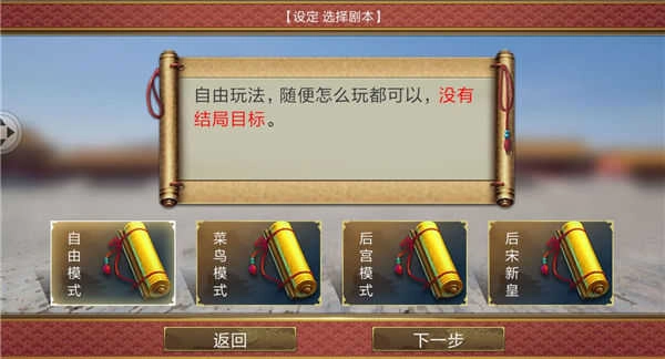 二、模式分为:自由模式、菜鸟模式(暂未开放)、后宫模式、后宋新皇;