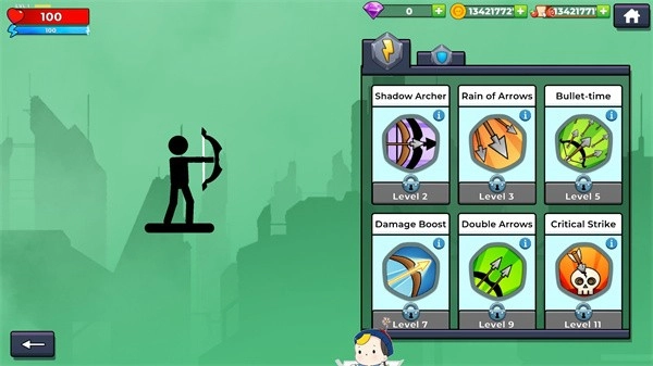 2、在火柴人弓箭手2收集金币和资源强化弓箭手的各项技能属性。