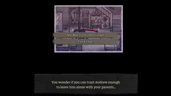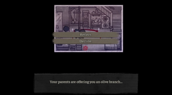 2.2 安德鲁的选择:关键选项,必须在「艾什莉的选择」选「信任护符」才会触发。若安德鲁选择「反思」父母的橄榄枝(上面)会进入腐朽线,反之选择「拒绝」(下面)则会进入埋葬线。