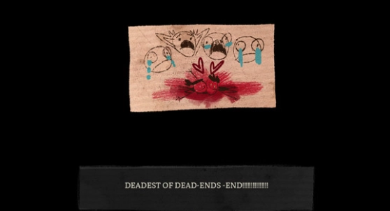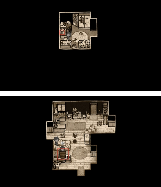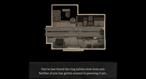 3. 婚戒:在囚禁线最后,没拿到戒指or把戒指扔掉(上面)可通向「死得不能再死」的跳楼死亡结尾;若保留婚戒(下面),则会进入「酒与枪与诸如此类」的怨偶结局。