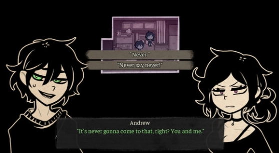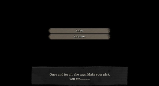 2. 安迪or安德鲁:关键选项,在车上艾什莉会逼迫安德鲁选择身份。若选择「安迪」会通往失败状态(fail state),所有路线中的安迪线剧情都一样;选择「安德鲁」则会有开启独有剧情。