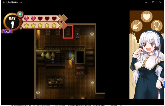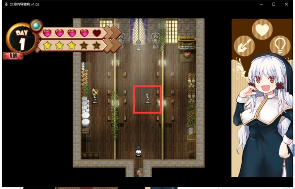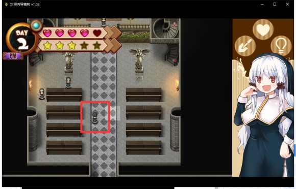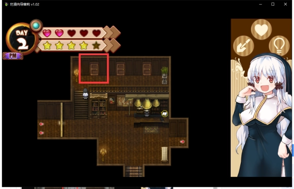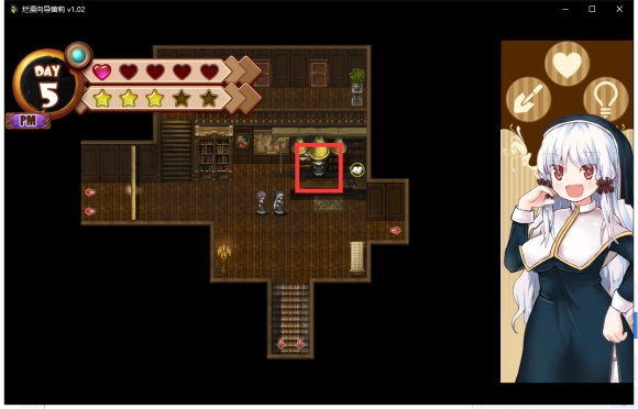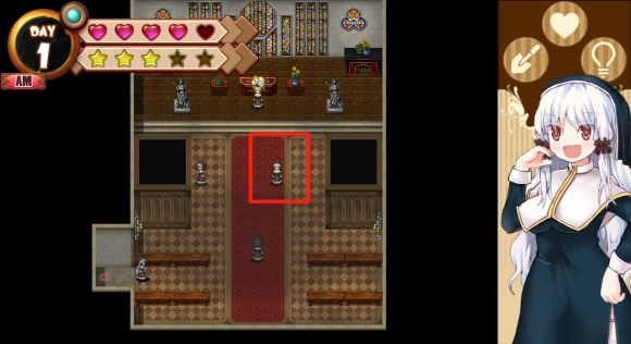第一天的事情就做完了,之后可以随便逛逛,但是不要问问题,可以与头顶带沙漏的修女对话做做工作。不同的工作有不同的效果,只要注意体力(红色爱心)和信任度(黄色五角星)任何一项都不能为0。且判断值(左上角的蓝色圆)不能变成黄色即可。