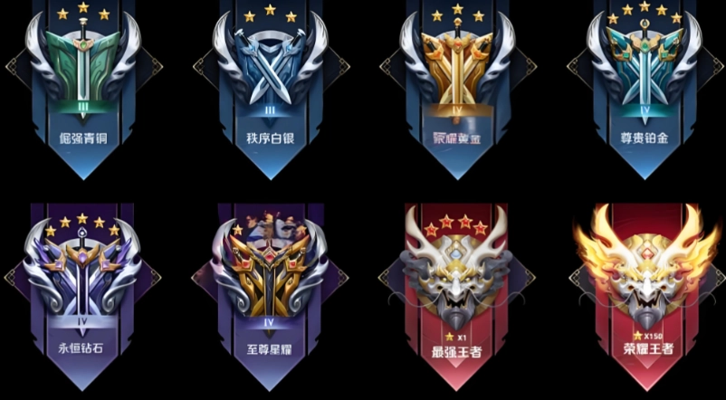 倔强青铜秩序、白银荣耀、黄金尊贵、铂金永恒钻石、至尊星耀、最强王者。