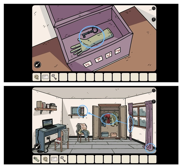 输入四个符号密码,打开客厅左侧的紫色的盒子拿到「手套」和「蓝色钥匙」,再用蓝钥匙打开二楼第一间房门,接着观察衣服以及窗帘打结的数量获得密码「1354」,最后打开保险箱获得「硬盘」。