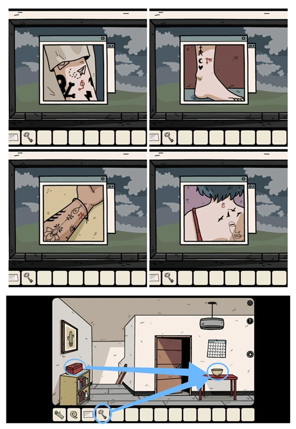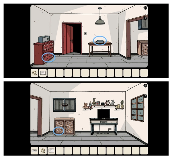 首先,从相框背后拿走“生锈的钥匙”,随后前往二楼右侧,把“数据线”、“胶带”以及“提示纸”一同取走。