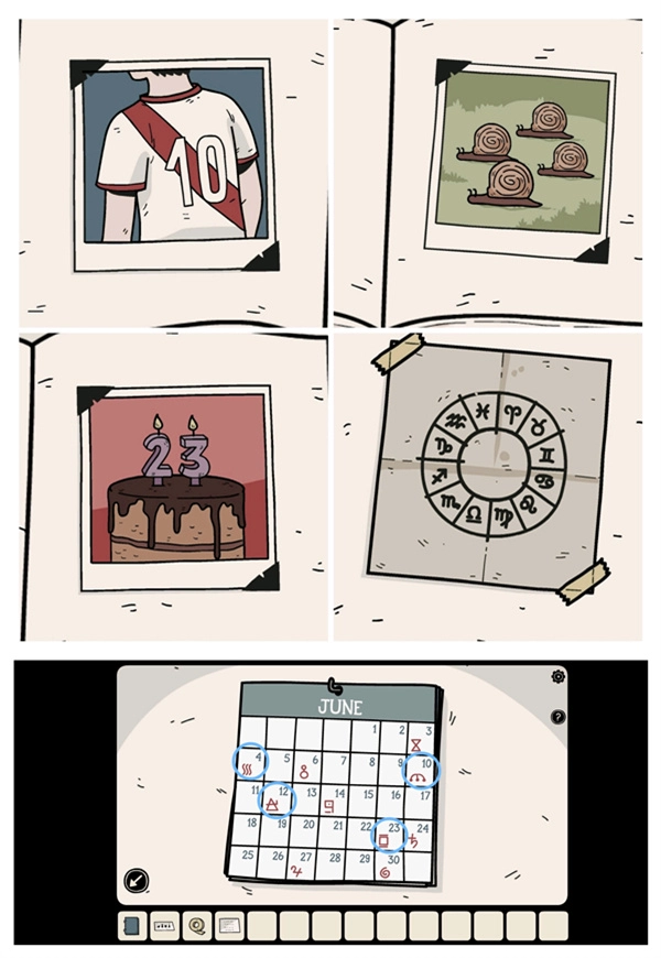 打开笔记本观察四张照片(注意数字和数量),再到二楼第一房间门口结合日历获得四个「符号」。