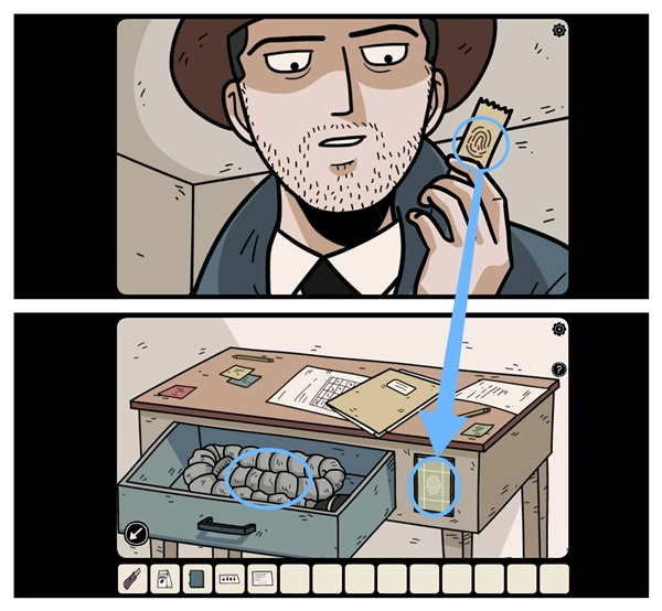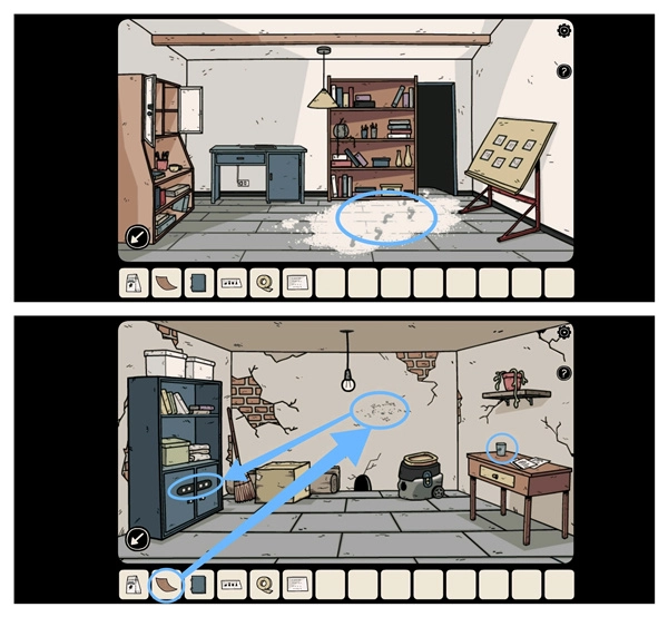 来到客厅触发剧情进入暗室,用砂纸清理墙壁上灰尘获得四个「图形密码」,接着打开左边的柜子拿到「毛刷」和「美工刀」。