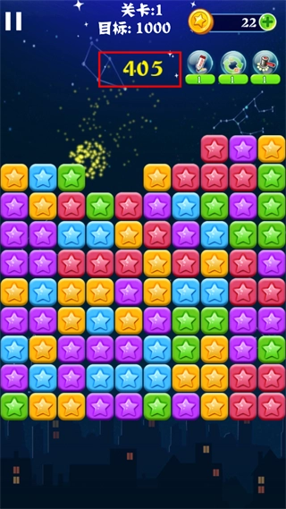 3、接着点击相邻且颜色相同的星星,即可将星星消除,同时获取分数。相邻的同色星星数量越多,所获分数也就越多。
