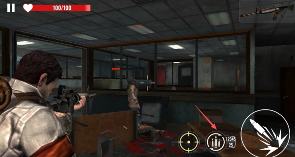 1、玩家进入游戏后,只需点击屏幕左侧区域进行瞄准,找到僵尸位置后,点击射击按钮便可开火。持续精准命中目标,就能迅速清除一波又一波涌来的僵尸。