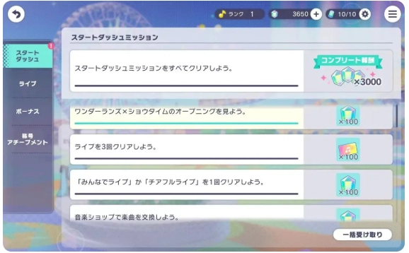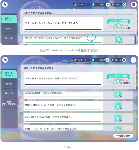 前5个完成方法很简单、进入MAINSTORY(主线剧情)、选择各个团,右上角改一下“開催順”,选择第一章(章节带有“メインストーリー”),每个团的第一章点进去,完成下图红色圈出来的部分。