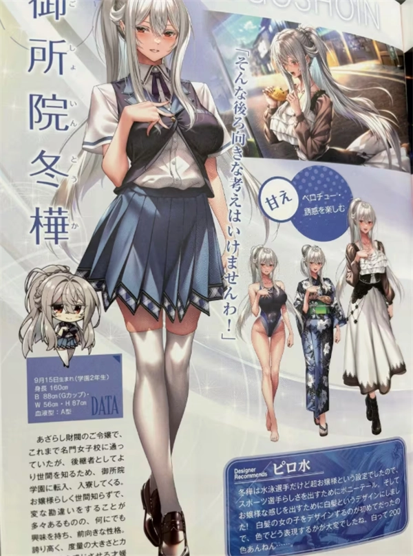 水老师的创作思路:因为冬桦的设定是游泳运动员的同时还是一位大小姐,为了突出运动员的身份,所以给了她马尾辫,然后为了突显大小姐的感觉就设计成了白发。因为是第一次设计白发的女孩,所以对这种颜色要怎样表现感到十分困扰,毕竟白色可是有200种啊……。(水老师你怎么会是第一次设计白发的角色?泪香难道不算白发吗?(*°▽°*)ノ)