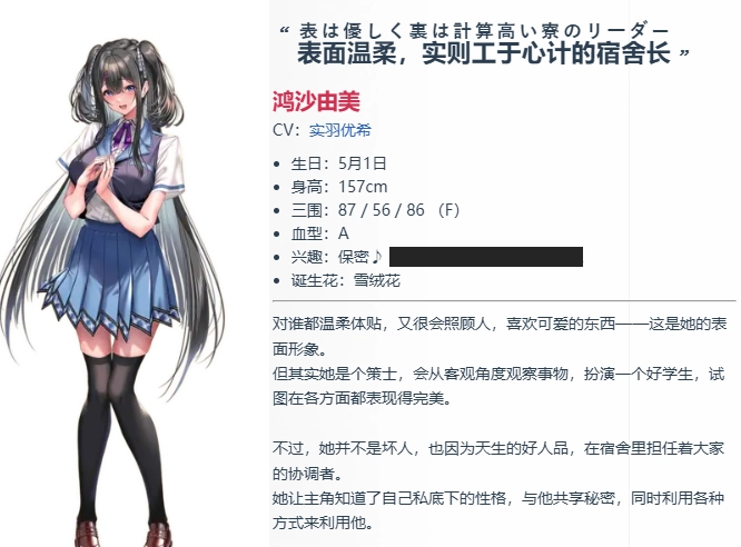 介绍:对谁都很温柔很会照顾人的同级生。非常喜欢可爱的东西的女孩!在这样的表面背后,却是一个深谋远虑,总是以最优策略行事,扮演者优等生的谋士。但天性中的善良还未消失,在宿舍里自然的成为了众人的主心骨。被主人公知道了“里人格”后,一边与其分享秘密,一边这样那样地利用他。