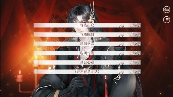 “容资出众”——容貌+300“气质脱俗”——气质+300“风情艳盛”——魅力+300“聪明伶俐”——心机+300“甚合心意”——圣宠+30“并不在意此话”——无任何属性加成个人建议:买了大礼包的姐妹建议选“甚合心意”