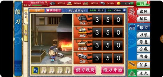 为了凑出这个阵容,过完新手任务就要去锻刀。如果在新审应援活动时期入坑,直接到手十几万的资源,放心大胆地锻。如果没这个活动,攻略8图进度将非常慢。
