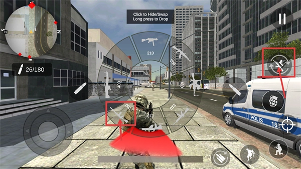 3、点击武器切换按钮可更换装备,当前弹药为【26/180】,长按可丢弃不需要的武器。
